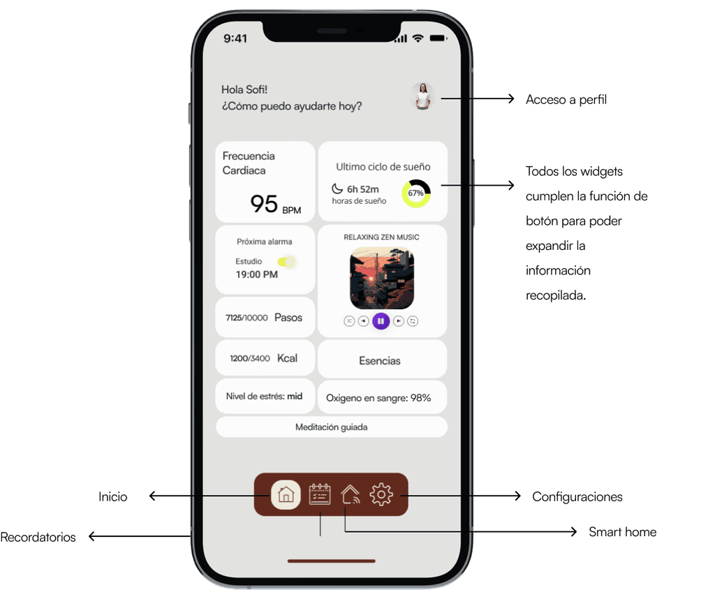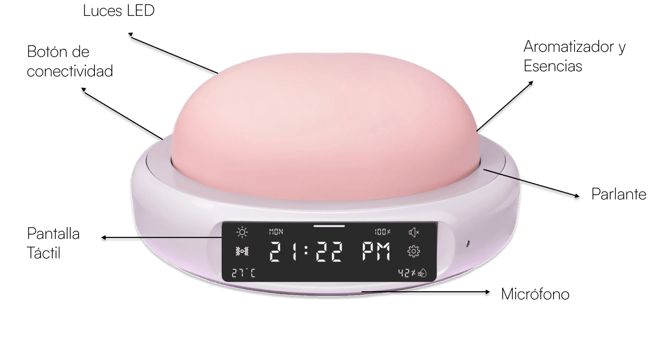 This virtual assistant combines vibration, lighting, and aromatherapy technologies to deliver customizable experiences. It creates environments tailored for relaxation or focus, using aromatic essences and adaptable lighting. The assistant provides personalized solutions for nutrition, exercise, mental health, and productivity. Designed to holistically support daily life, it helps users establish healthy routines and promotes a balanced lifestyle. By monitoring behavioral patterns, it offers tailored recommendations to enhance well-being. Additionally, it aids in task organization and time management, ensuring a harmonious balance between responsibilities and personal wellness.