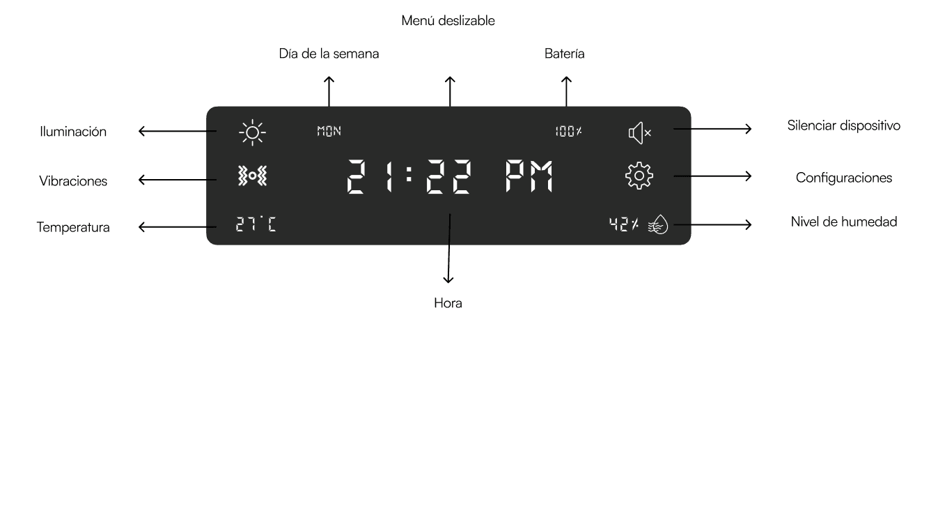 The clear visual hierarchy prioritizes the time display at the center, making it the focal point and ensuring quick access to the most critical information. The use of intuitive iconography for settings, sound, vibration, and humidity reduces reliance on text, making the interface accessible to users across different languages. Additionally, the design leverages symmetry and organization, with evenly distributed elements that create a clean and balanced layout, minimizing cognitive load. Finally, the minimalist design—featuring a high-contrast black background with white text—ensures readability in low-light environments, making it ideal for bedside or ambient settings. These elements collectively contribute to a sleek and functional interface that supports ease of use.