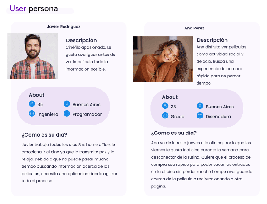 Javier is a passionate movie enthusiast who loves to gather as much information as possible before watching a film. He works 8 hours a day from home and finds going to the cinema a relaxing escape from his routine. However, due to his limited time, he needs an application that simplifies the process of finding movie information and purchasing tickets efficiently.
